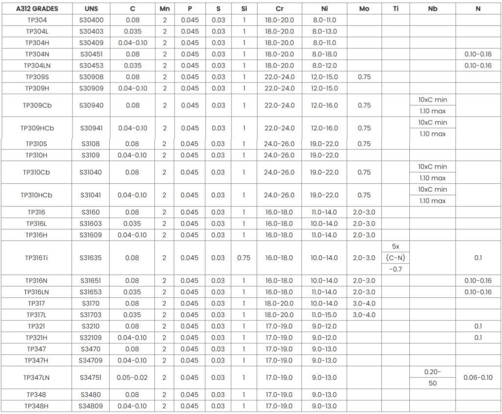 201, 201LN, 204, 304, 304L, 304H, 304LN, 304N, 309S, 309H, 310S, 310H, 310MoLN, 312, 316, 316L, 316H, 316LN, 316N1, 316N2, 317, 317L, 317LN, 317LM, 317LMN, 326, 304Ce, 308Ce, 309Nb, 309HNb, 310Nb, 310HNb, 316Ti, 317LCu, 321, 321H, 345, 347, 347H, 347LN, 904L, 904LN, 1803 ( 31803), 2101 ( 32101), 2205 ( 32205), 2304 ( 32304), 2507 ( 32507), 2760 ( 32760), N1, N7, TPXM-10